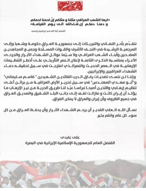 القنصل العام للجمهورية الإسلامية الإیرانية في البصرة یبعث برسالة تهنئة إلی جمهورية العراق حکومة وشعبا بمناسبة ذکری یوم النصر